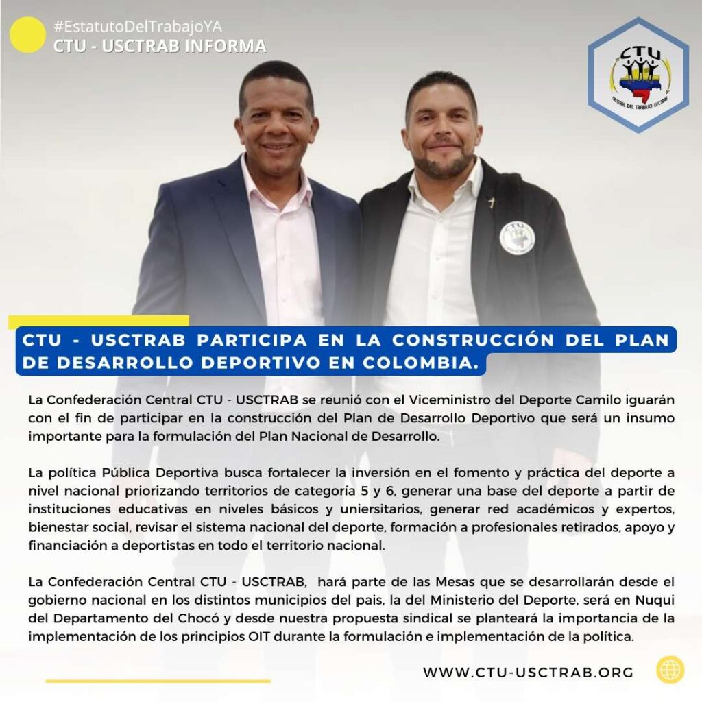 CTU – USCTRAB participa en la construcción del plan de desarrollo deportivo en Colombia Publicado por USCTRAB | Sep 29, 2022 | Es Noticia | 0 |